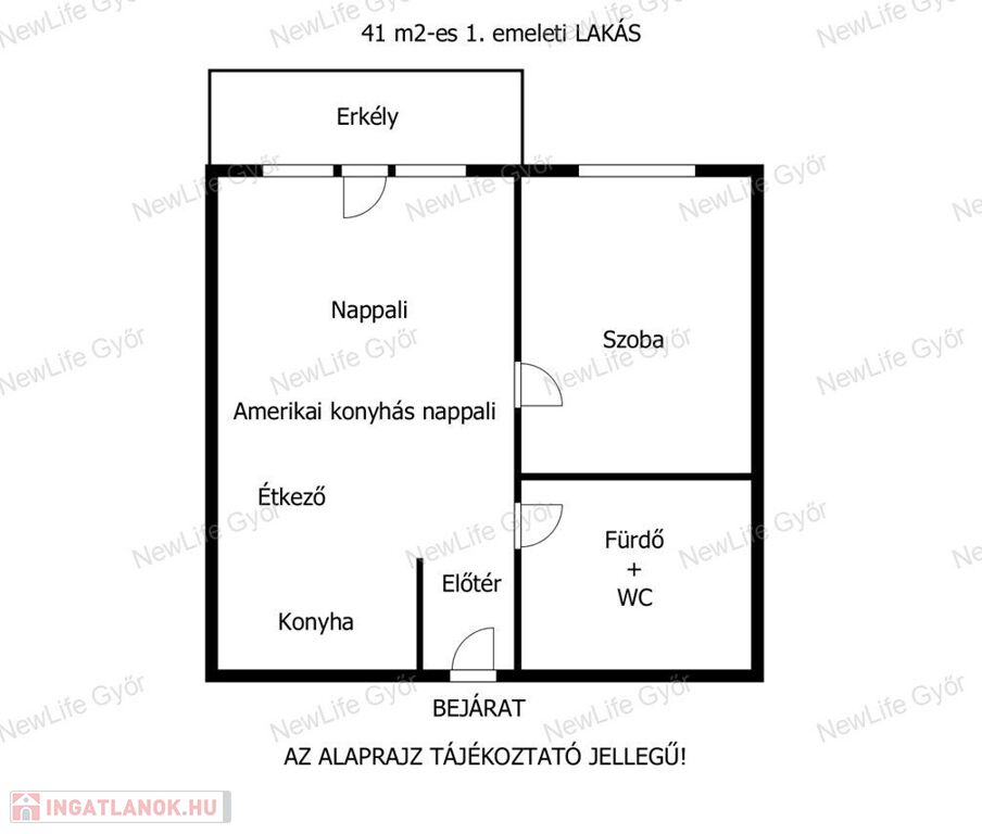 Elosztása: előtér, nappali–konyha–étkező, hálószoba, fürdőszoba–WC