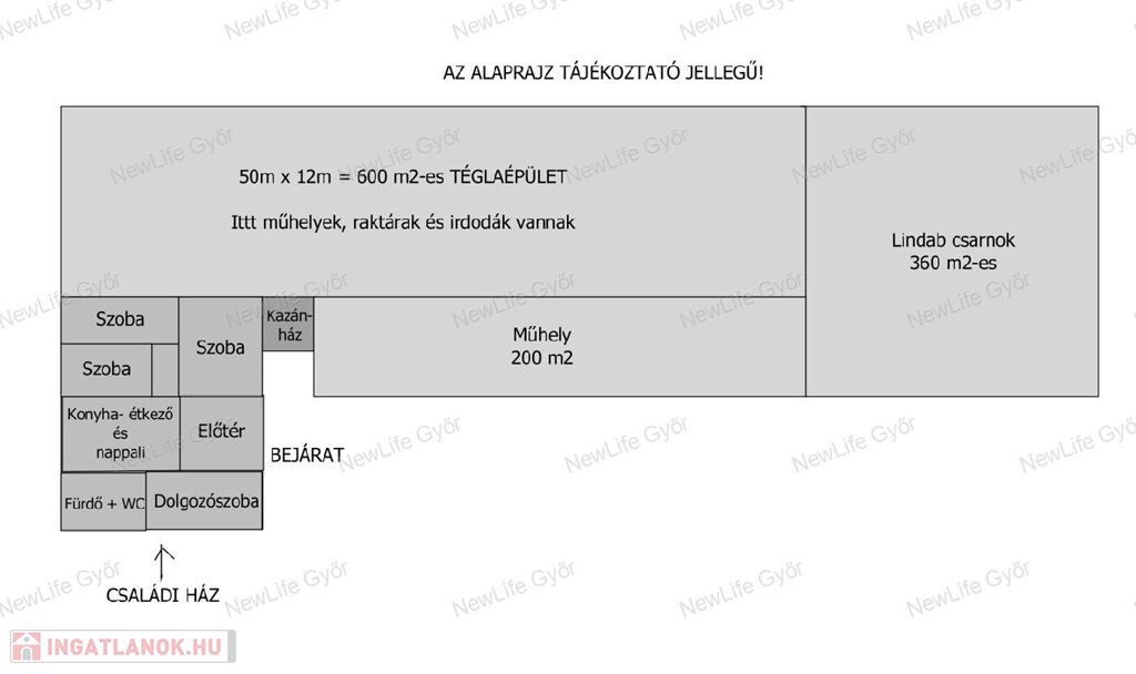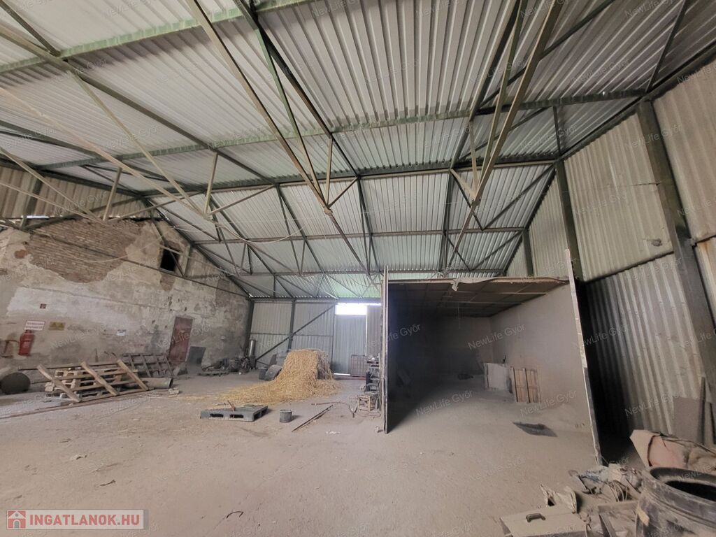 - 50×12 m-es tégla raktár (iroda, konyha, ipari áram, gázcsonk, felszerelt radiátorok)