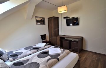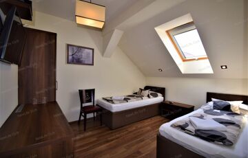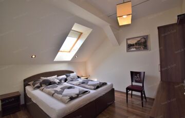 Panzió: 20 fő magas színvonalú elhelyezésére biztosít lehetőséget az következő elosztásban: 6 db kétágyas szoba, 2 db franciaágyas szoba és egy családi lakosztály egy kétágyas és egy franciaágyas szobával.