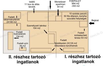 II. rész irányára: 194 MFt, mely tartalmazza a főépület végét, kb 350 m2-nyi, 11 boxot és állást, tárolókat, 2*180 m2 fedett takarmánytárolót, 154 m2 fedett szénatárolót, 34 m2 méretű fedett színt és egy személyzeti komplett lakrészt 104 m2en. A főépülettel szemben található (másik) 135 m2 területű fedett mobilkarám, mely szükség esetén bontható, vagy autóbeállók alakíthatók ki belőle.